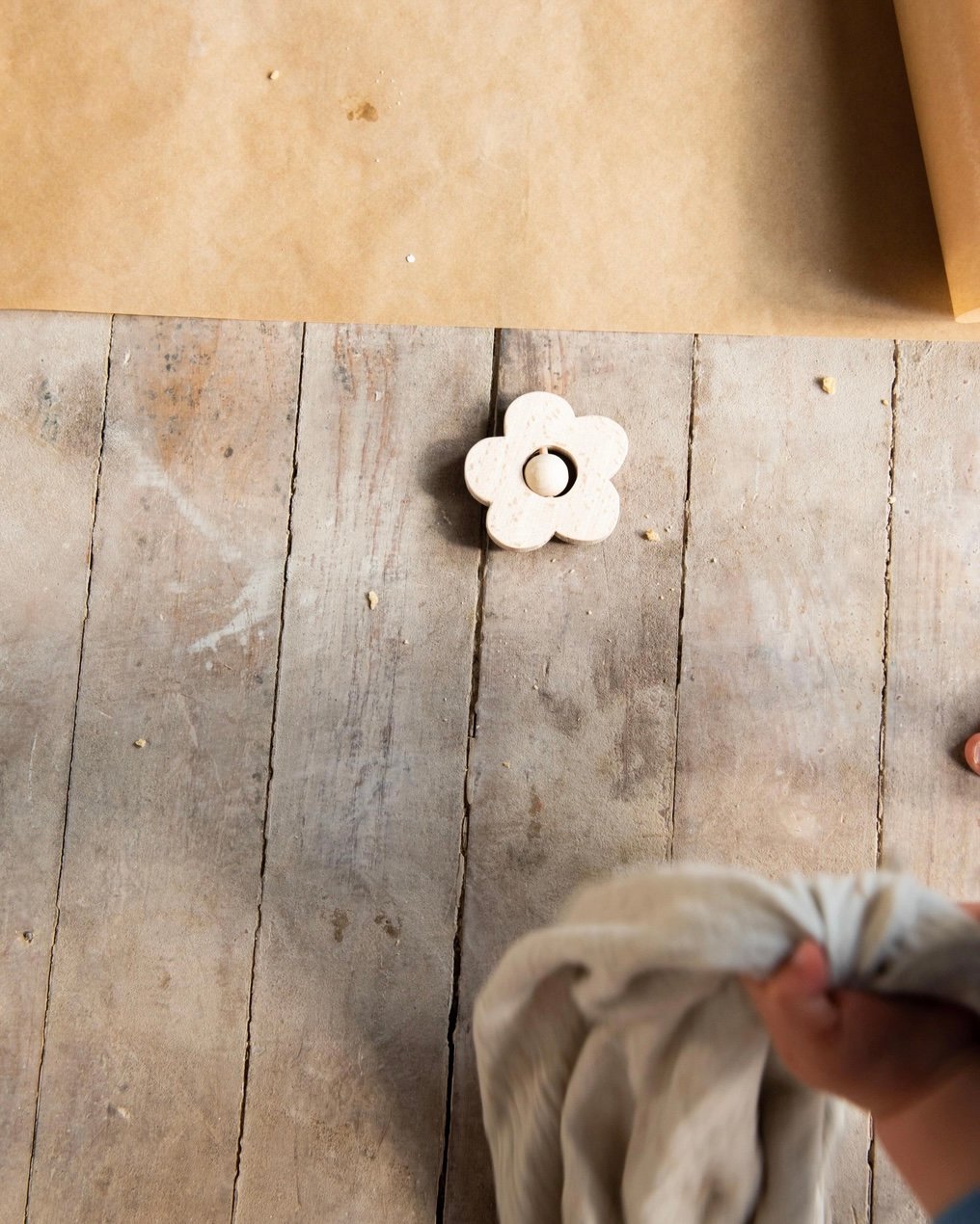 Une fleur en bois qui peut être porté à la bouche pour soulager les gencives. Un jouet en bois brut, sans vernis ni produits, à offrir dès la naissance.