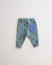 Legging en sweat bouclette coloris vert et motifs traits. Facile à enfiler. Elastique de taille confortable. Poche au dos.