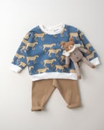 Confectionné dans une matière bouclette en coton biologique, légèrement texturée et respirante, il accompagne les jeux, les aventures et les câlins.