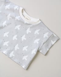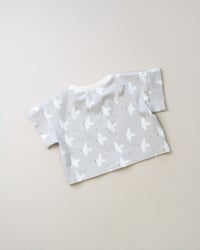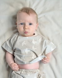 Confectionné en jersey de coton biologique, souple et respirant, il accompagne les jeux et les découvertes du quotidien.